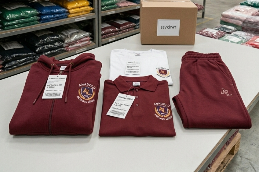 En az 50 adet okul tişörtü veya hoodie için standart kumaş, tek renk baskı ve temel beden dağılımı dahildir.